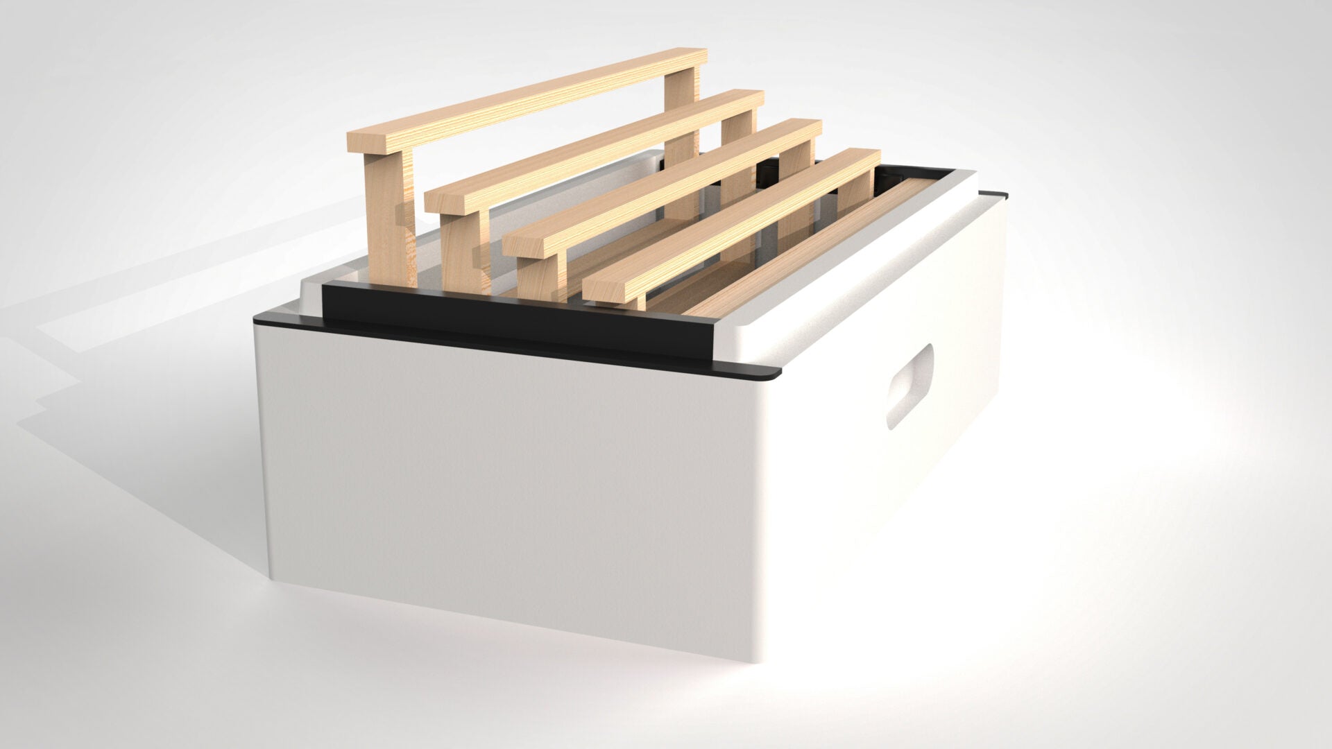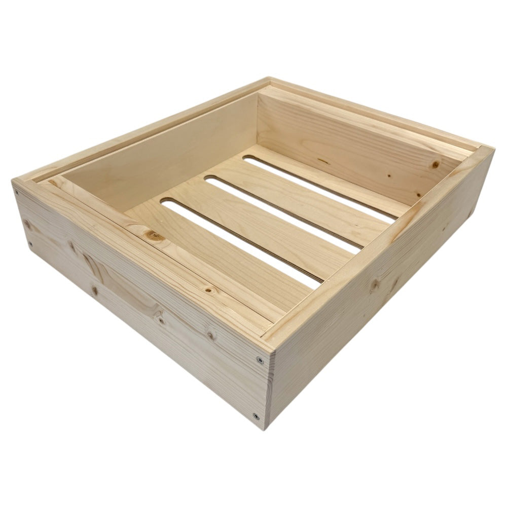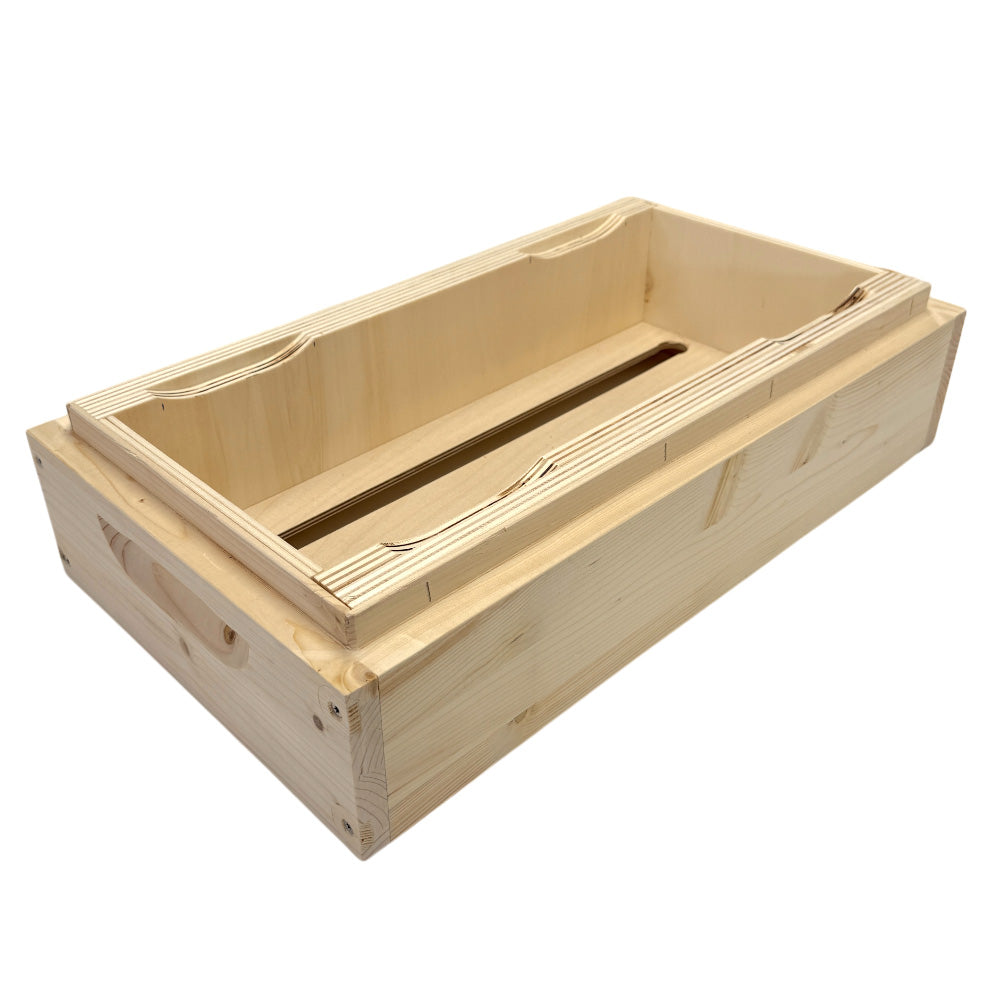 Komplett montierte Honigraum für Wabenhonig im gewählten System mit Distanzkeilen zum exakten ausrichten der Rähmchen für Wabenhonig. Diese können in verschiedenen
