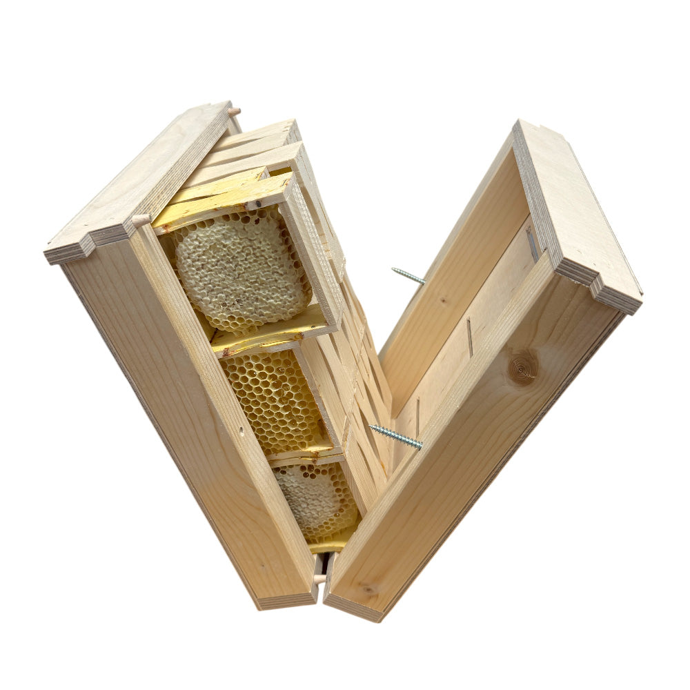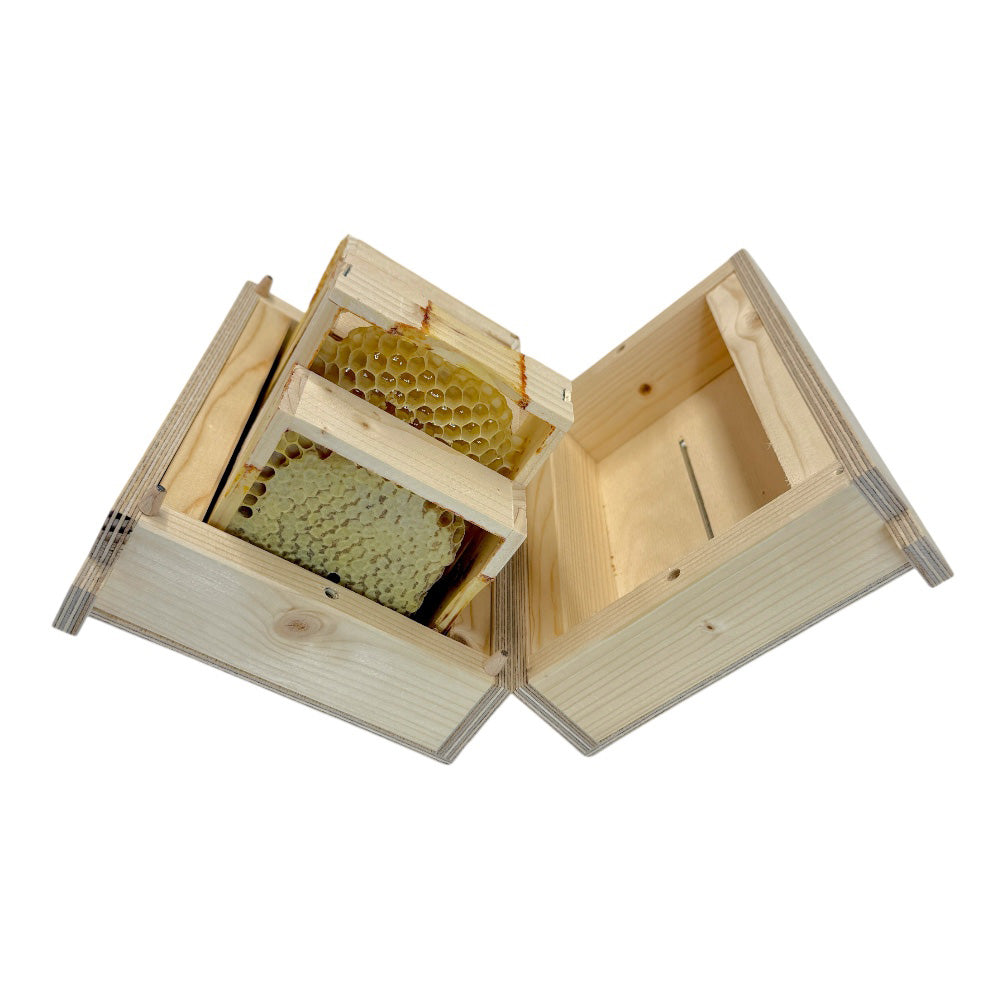 Entwickelt von Bienen-Janisch in Zusammenarbeit mit dem Königinnenzüchter Lutz Eggert. Das einfach zu handhabende System zur Produktion von Wabenhonig benötigt den Platz von 3 herkömmlichen Honigraumrähmchen im Honigraum. Schief- oder Wildbau wird minimiert. Da die Rähmchen eng aneinanderliegen, gibt es kein unnötiges Propolisieren. Der Ausbau der Rähmchen sowie das Gewicht des eingetragenen Honigs sind sehr homogen. Wabenhonig ist die natürlichste Art, Honig zu genießen – direkt aus dem Bienenvolk zu Ihren Kunden nach Hause. Mit Verständnis für die Prozesse im Bienenvolk und der Natur gelingt hier dank des Kleinklimas in den Taschen eine außerordentliche Honigqualität – einfach nebenher zur gewohnten Betriebsweise. Die exakt ausgebauten Wabenstücke in unseren Rähmchen aus Lindenholz passen perfekt in die dazugehörigen Verpackungen. Beachten Sie unsere Hinweise zur Produktion von Wabenhonig – diese stehen Ihnen zum Download bereit und sind jeder Tasche beigefügt. Erleben Sie das einzigartige Glücksgefühl in dem Moment, wenn Sie die Tasche öffnen und der verdeckelte Honig Ihnen entgegenlacht! Dieser Honig zeugt von höchstem handwerklichem Geschick – der Stolz des Imkers.